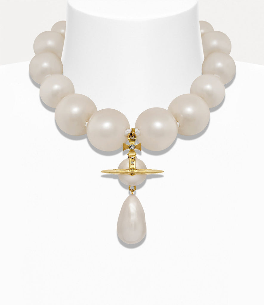 Inspired by the jewellery pieces originally seen in Vivienne's Red Label Autumn-Winter 1999/2000 collection, the Giant Pearl Drop necklace features a row of hand-knotted baroque pearls that graduate in size, along with a three-dimensional orb drop.